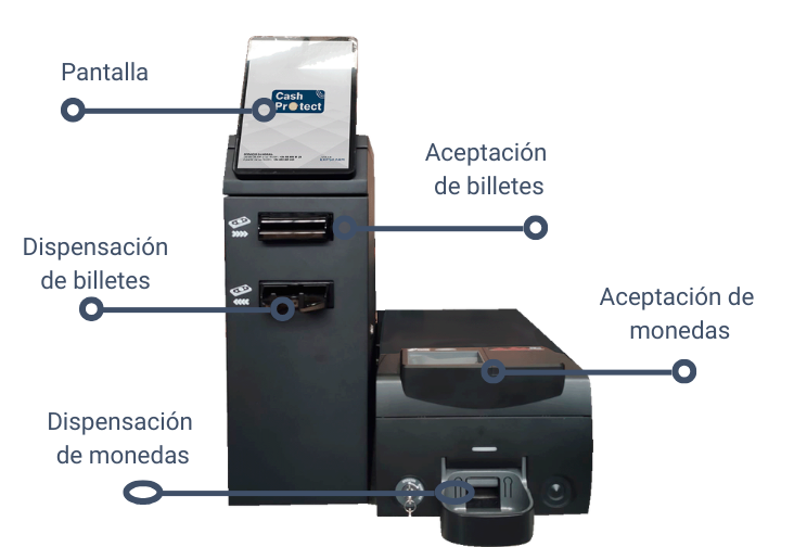 Cuenta con aceptación y dispensación de billetes y monedas, además de una pantalla interactiva.